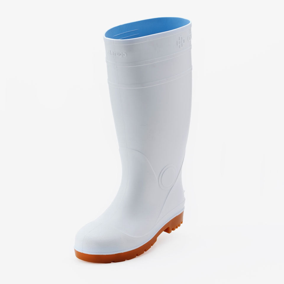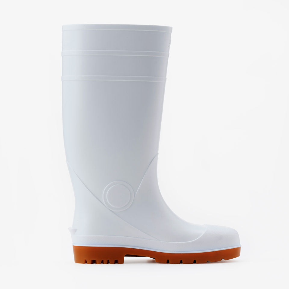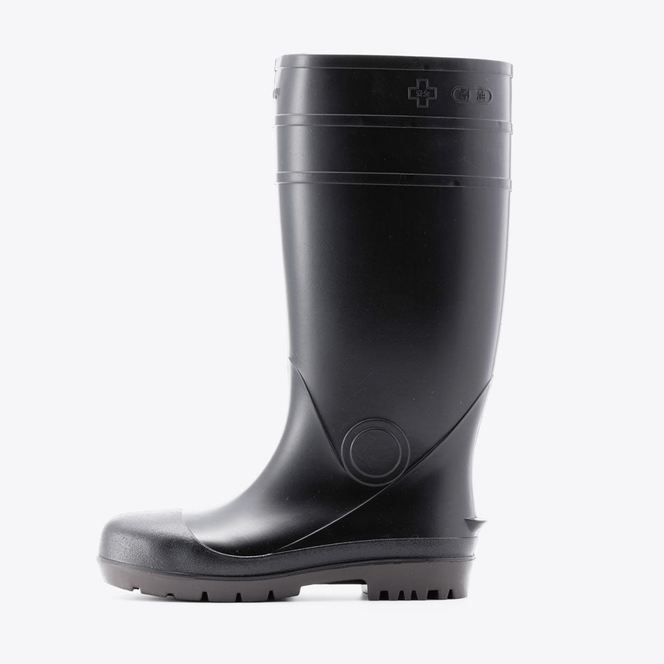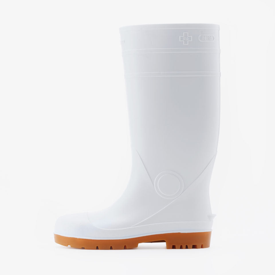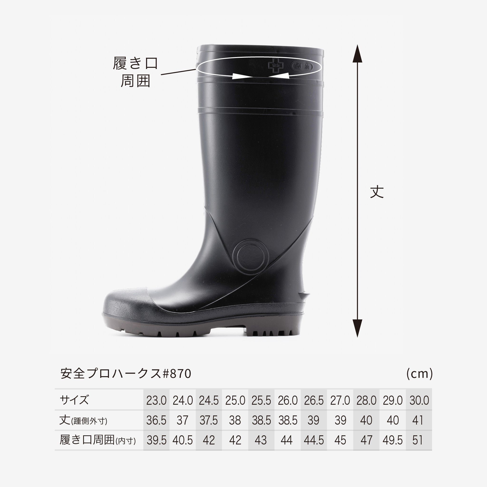 抗菌加工・耐油仕様のPVC長靴、安全プロハークス#870。つま先を保護する先芯入りタイプ。取り外しが可能なインソールの下には凹凸があり、空気を放出し長靴内のムレを軽減します。長靴の中にズボンを入れてもズレ上がりにくいズボン止めを採用。土木建設・食品加工に最適です。