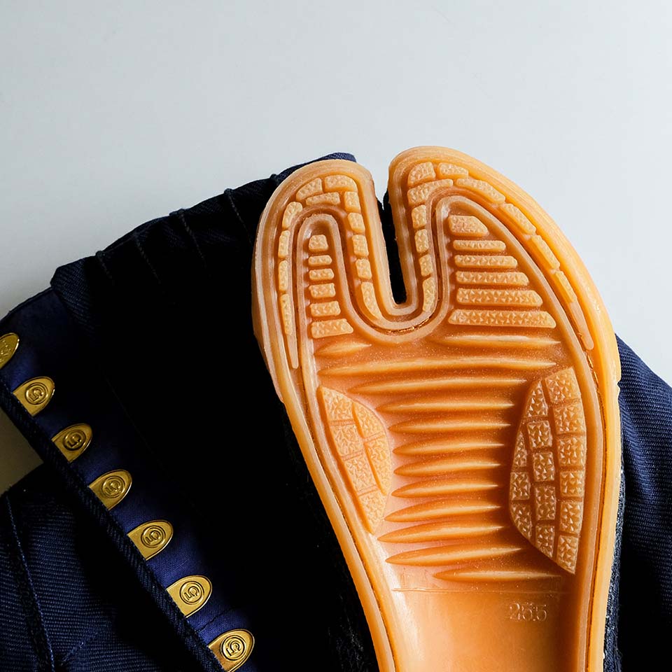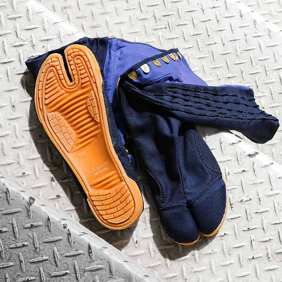 つま先ガード付きの靴底縫付タイプ作業用地下足袋。足にフィットしやすいカケ糸(受け糸)5本仕様を採用し、高所作業を考慮した底意匠で安全性と安定性を確保。土木・建築現場での作業に最適な一足です。