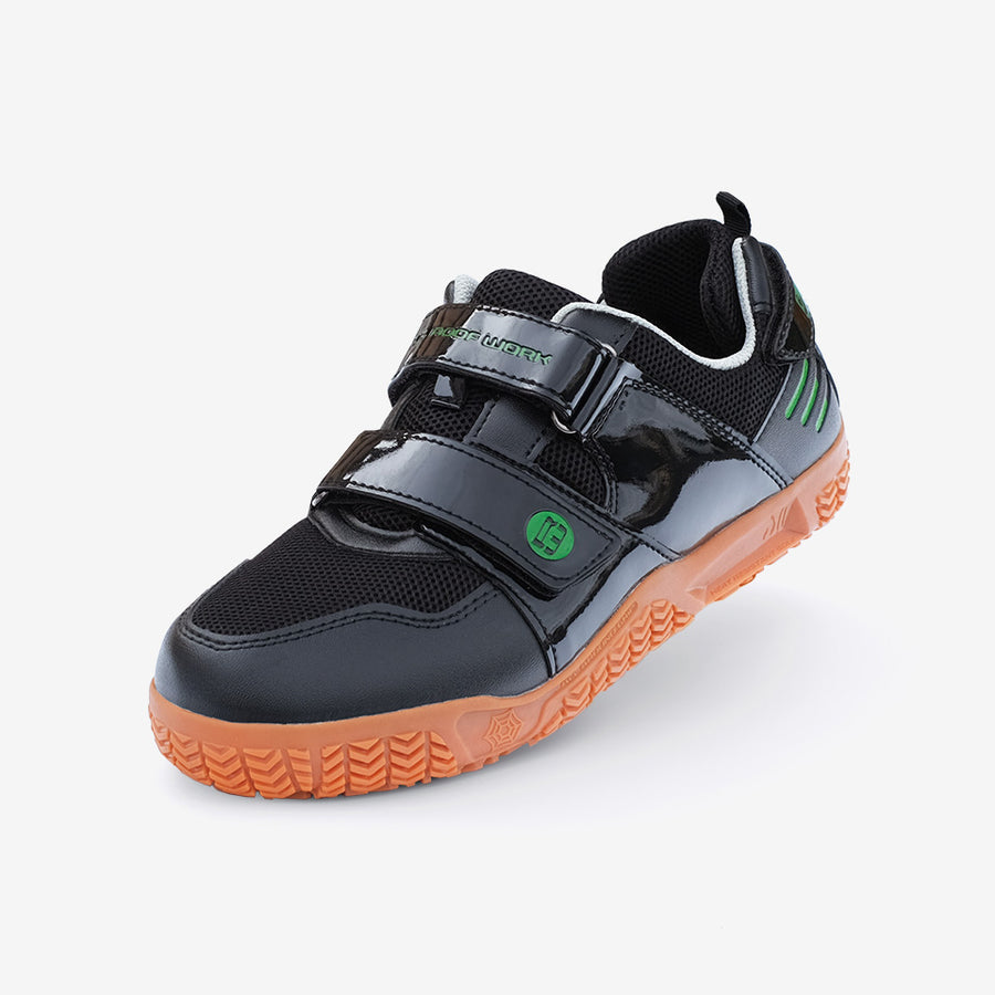 屋根作業向け作業靴 屋根やくん。屋根の熱から足裏を守る断熱材の入ったソールは、斜面でもグリップが効く巻き上がったデザインを採用。対方向タイプのマジックは、対方向から締めることで靴紐のようなフィット感を実現。