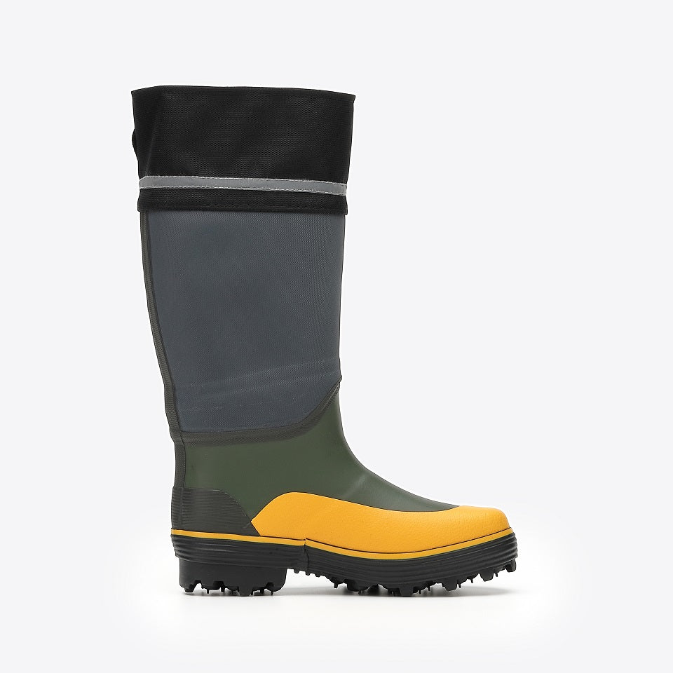 片足37本の鋼製ダブルスパイクピンを搭載し、滑りやすい斜面やぬかるみでもしっかりグリップ。水や異物の侵入を防ぐフード付き。筒太の胴部には合成繊維とゴムシートの二層構造を採用し、耐突刺し性能を強化しました。