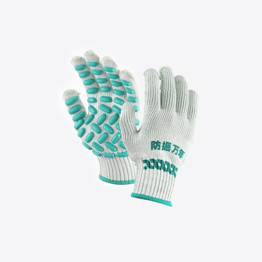 工具の振動を軽減させる振動作業用手袋。転写タイプ。手のひらの防振突起が電動工具からの振動を軽減します。非装着時と比べて、最大80%の振動カット。