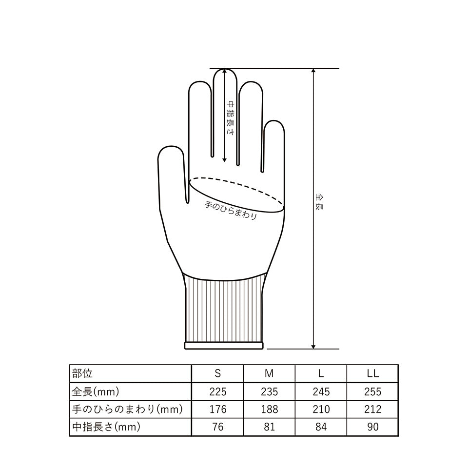 - サイズ(S):全長22.5cm、手の平まわり17.6cm、中指の長さ7.6cm