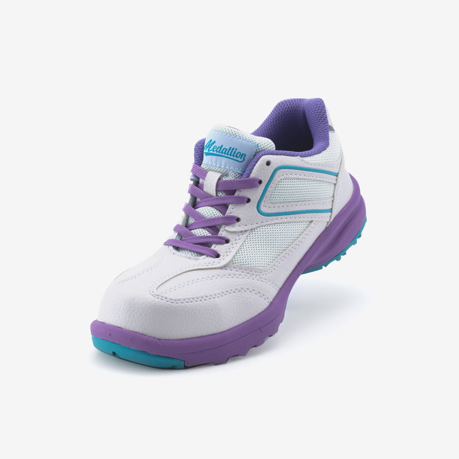 女性の足に合わせたラスト(足型)を採用し、抜群のフィット感を実現したワークシューズ。片足約260g(23.5cm代表値)の軽さで、先芯入りとは思えない軽快な履き心地です。クッション性に優れた肉厚のEVAミッドソールが足への衝撃をしっかり吸収し、長時間の作業でも快適さをキープ。軽さと履き心地にこだわった、女性のためのワークシューズです。