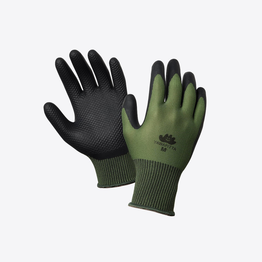 やわらか素材の発泡天然ゴムが、手に密着してぴったりフィット。指先まで自在に動くので、細かい作業もラクに行えます。