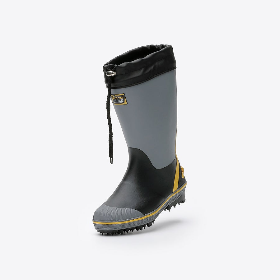 防水スパイクブーツのエントリーモデル「プロレインスパイクM-31」。片足18本の鋼製スパイクピンが、しっかりと地面をグリップします。胴部は屈曲部の傷みにくさにこだわったシンプルなデザインです。