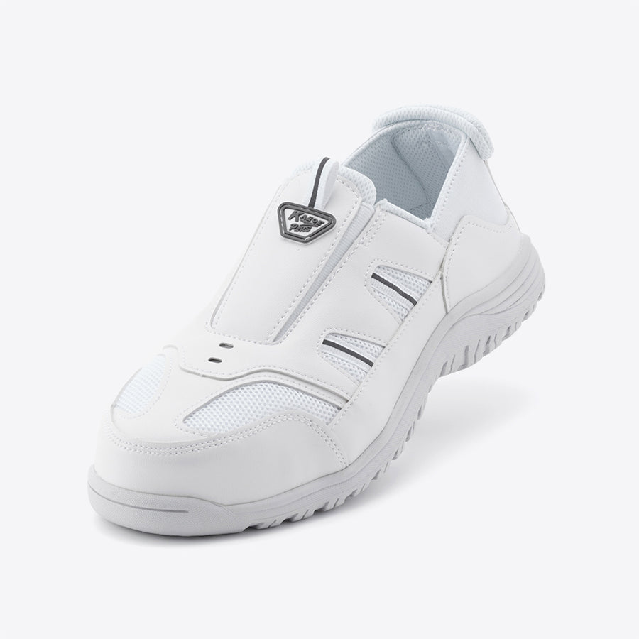 かかとを踏んでサンダルのようにも履ける、便利な2WAY仕様の作業靴「クレオスプラス#810」。かかとを踏んでもしっかり足にフィットする設計で、脱ぎ履きの多い現場や休憩時も快適です。さらに、床を汚しにくいノンマーキング配合のソールを採用し、屋内作業にも安心してお使いいただけます。