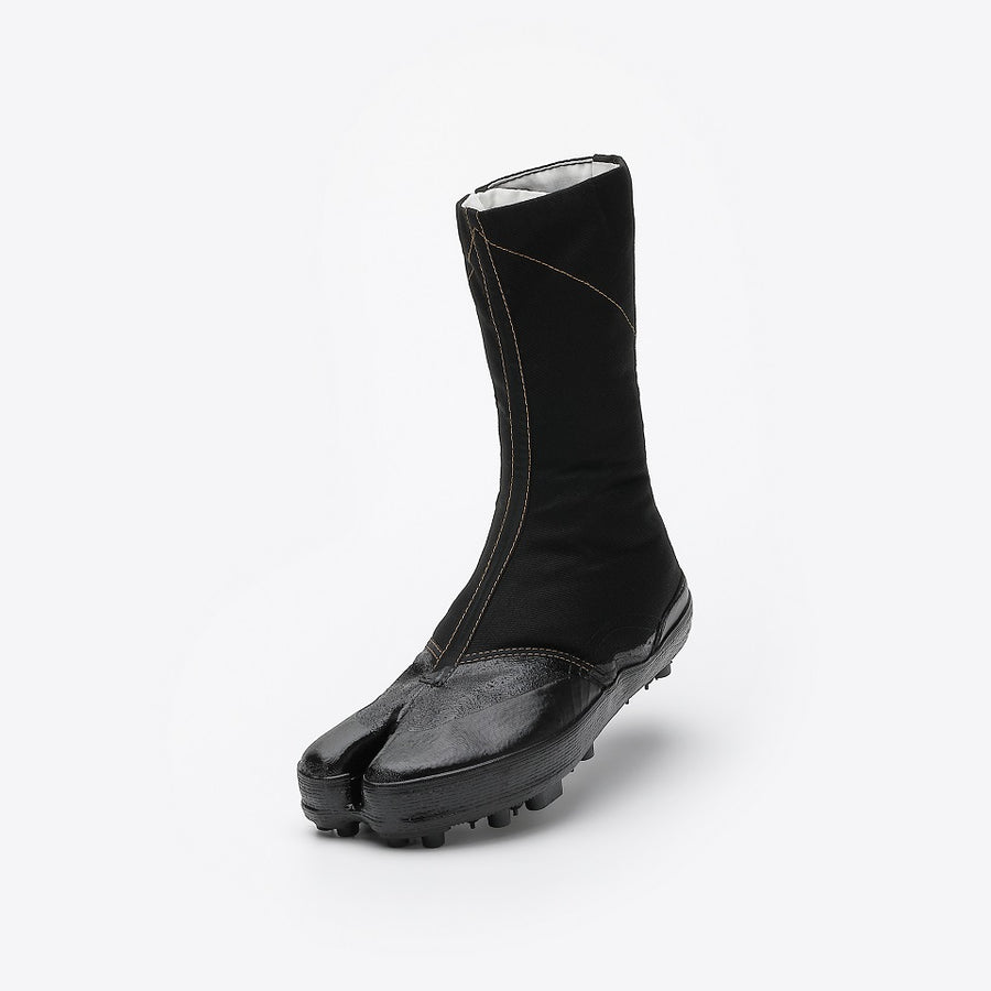 作業用地下足袋 スチールスパイクピン付。アッパーに糊高加工が施されているのでぬかるみや朝露で効果を発揮します。さらに、つま先の先割れ部分は結合されており、枝などの挟み込みを防止。森林作業に最適な一足です。