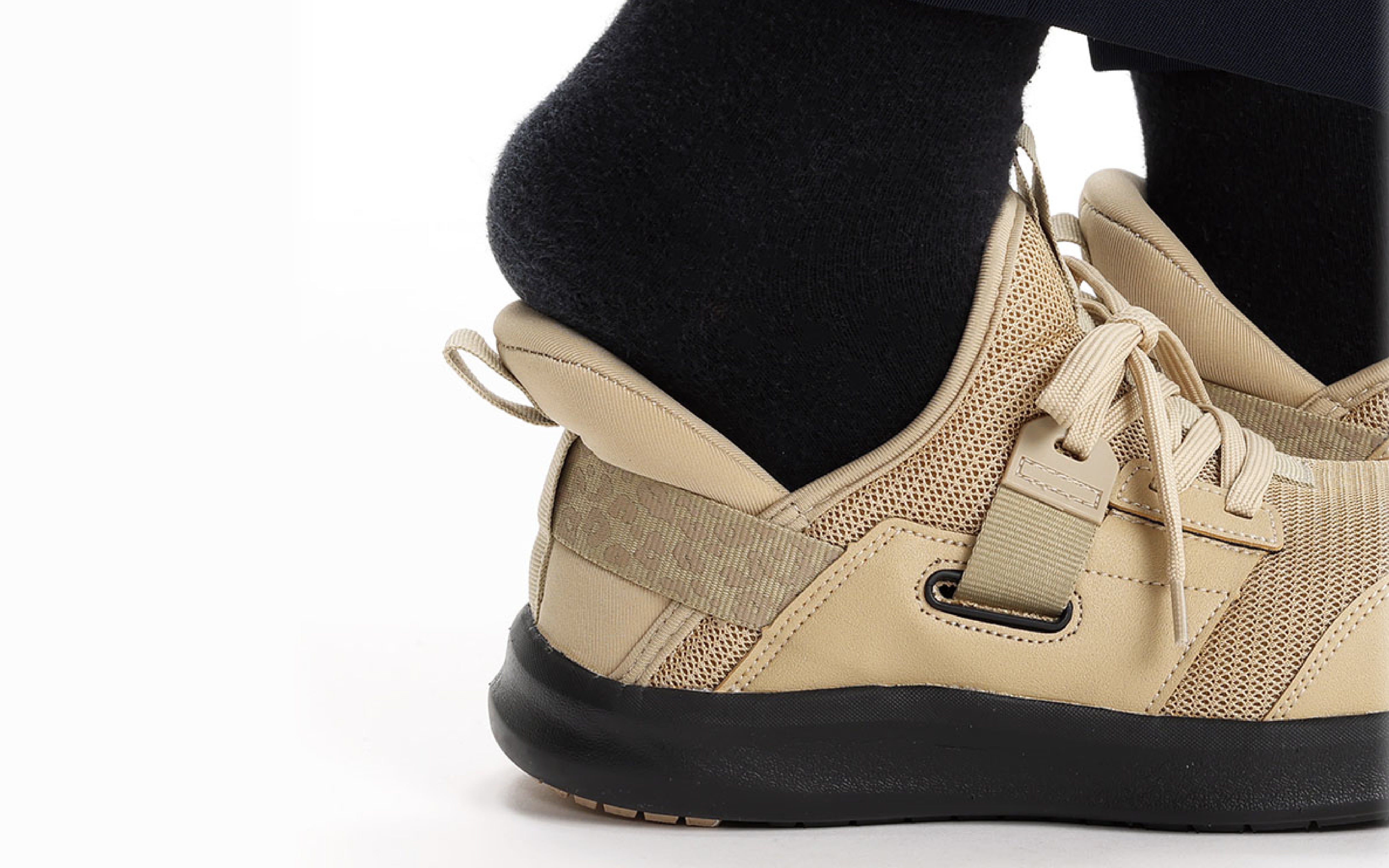紐を締める事で、土踏まずのインソール高を調整できる『フィットベルト』を搭載。その日のコンディションや好みに合わせて調整する事が出来ます。アーチを刺激する事で血行が促進され、冷えやむくみにアプローチ。疲れを和らげます。