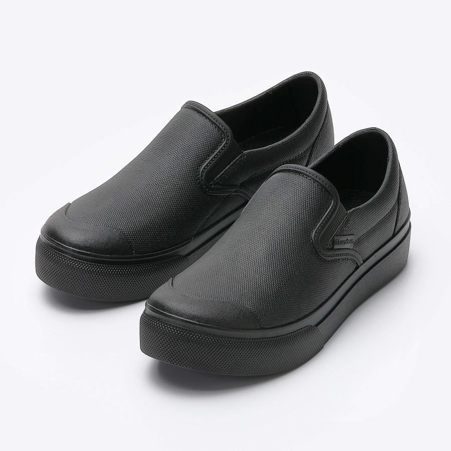 防水スリッポンシューズのマンダム#56。丈が短いので長靴のように「いかにも」感がなく、さりげなく足元を守ります。水や汚れを気にする作業だけでなく、雨の日の通勤・通学にもオススメです。取り外しが可能なメッシュインソール付き