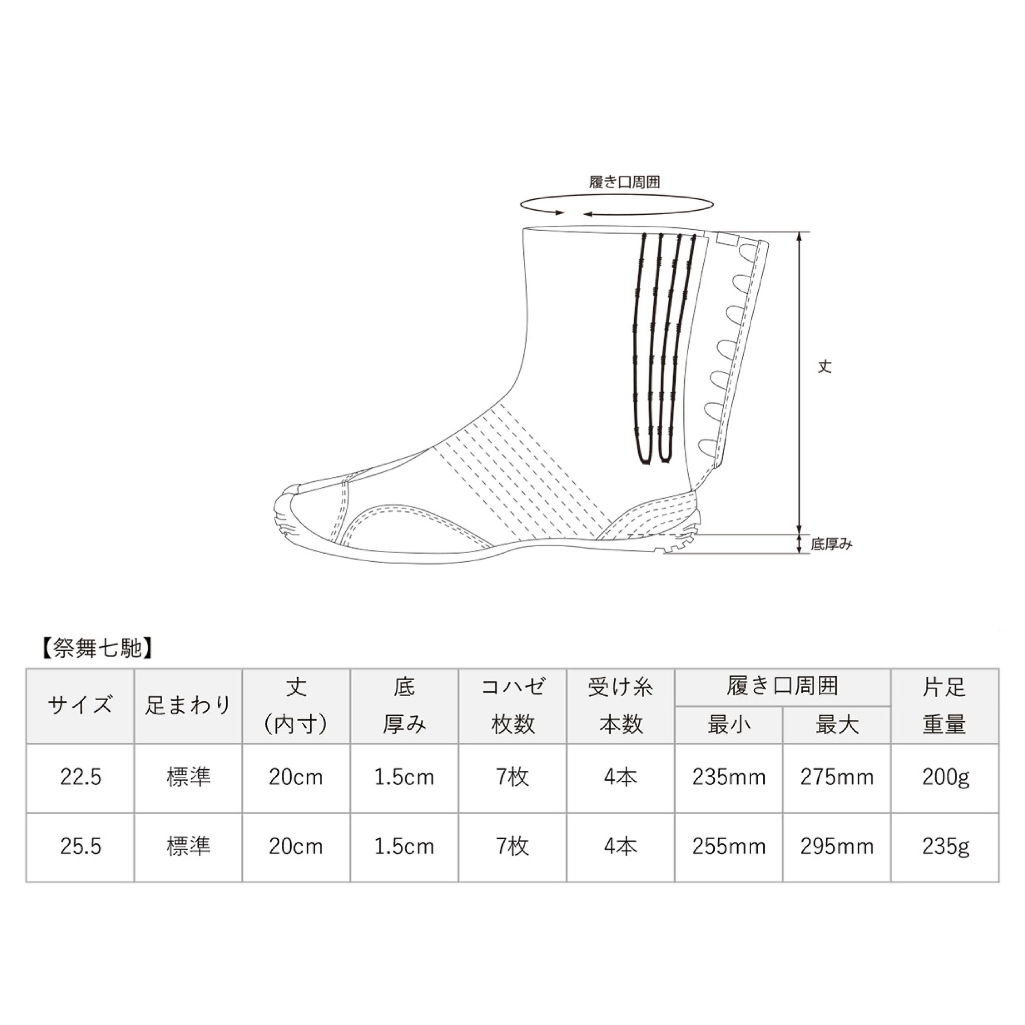 フィット感に優れ、足の自由度が高い祭舞七馳(さいぶななはせ)。サイドは人気のジョグ底のような波型ですが、底部分には独立した底意匠を採用。様々な動きに対応できる、屈曲性に優れる地下足袋です。